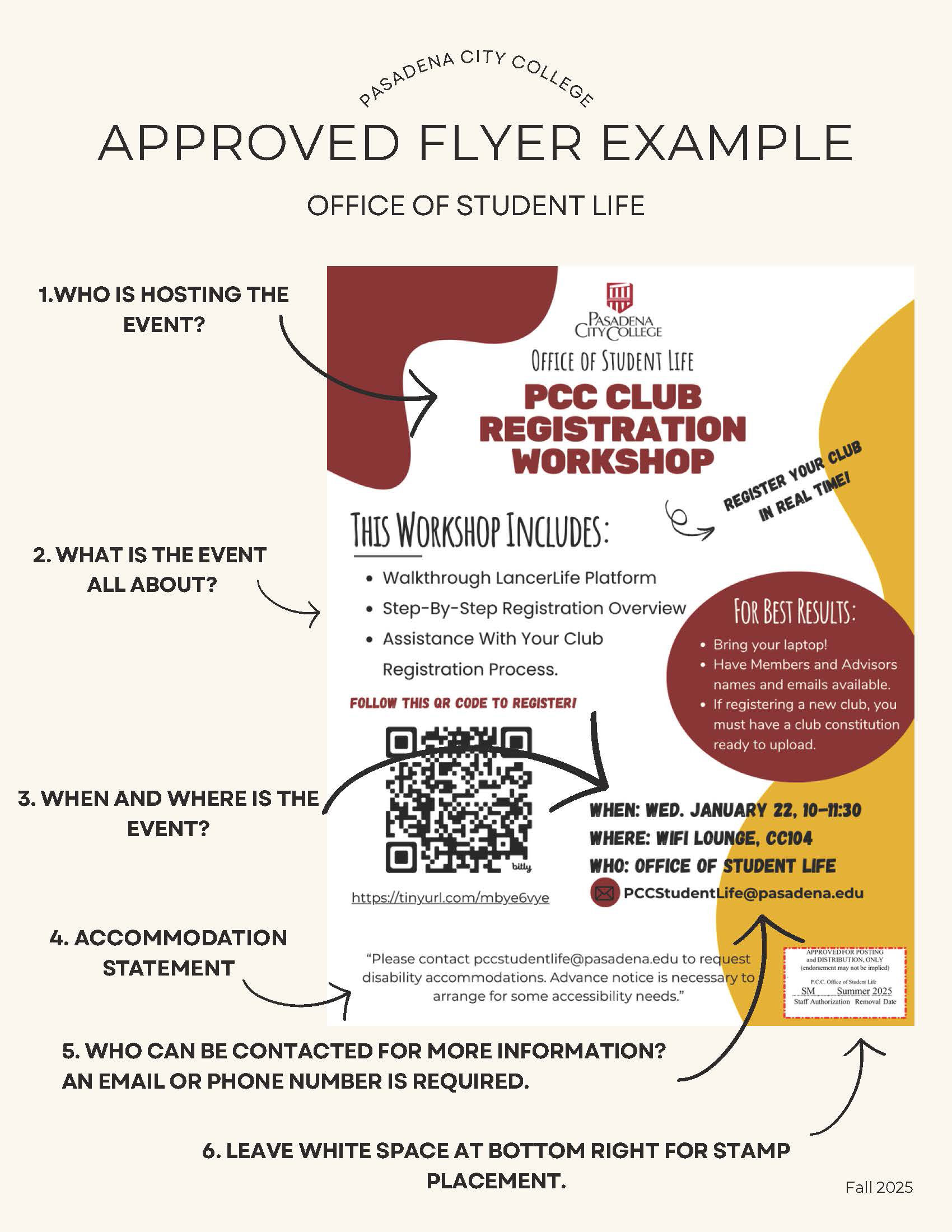 - An accommodation statement with this exact wording: “Please contact pccstudentlife@pasadena.edu to request disability accommodations. Advance notice is necessary to arrange for some accessibility needs.”