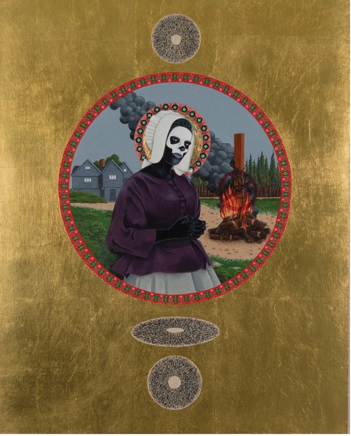 PCC Galleries Presents Venerated, an exhibition of new work by Mark Steven Greenfield. Venerated updates and expands on his Halo series, which depicts historical Black figures, resistance leaders, folk saints, and survivors from the 1400’s- 1800’s who have often been marginalized or omitted. Greenfield aims to not only honor the stories of black individuals in history but also specifically highlight their contributions to other political movements and paradigm shifts of other rights that are being challenged and erased, including transgender rights, reproductive rights, religious rights, and voter rights. Venerated in this case is an exhibition about interconnected solidarity. It upholds the value that honoring the suppressed history of one people can uplift the dignity of all people.