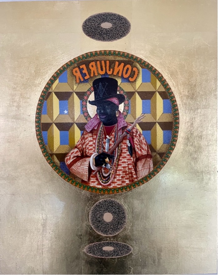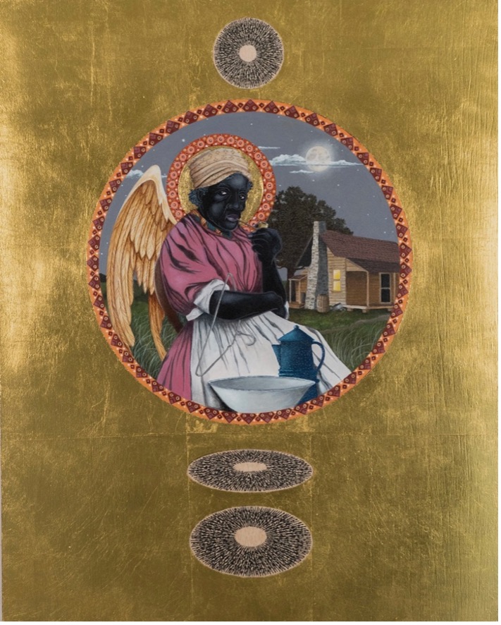 Greenfield’s work weaves together themes of race, identity, and historical memory with visual complexity and spiritual symbolism. He interrogates how African American identity is constructed, distorted, omitted, or stereotyped in broader culture, often revealing what has been erased or hidden from mainstream narratives. His current practice retrieves lesser-known figures, events, and stories—folk saints, martyrs, and enslaved people—bringing them into visibility. Greenfield borrows from religious art, particularly Christian iconography, as well as Yoruba Egungun, which grounds his work both as a critical investigation of symbols and images, as well as well as a sincere practice of spirituality and ritual play. Symbols such as halos, mandalas, gold leaf, and devotional imagery are reimagined to honor and valorize Black subjects. Many of his works juxtapose past and present, beauty and violence, placing scenes of religious serenity or reverence alongside stark depictions of racial violence and social injustice, creating a tension that challenges viewers to confront the complexities of history and memory.
