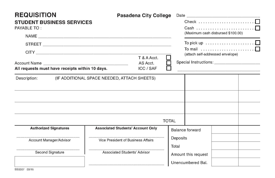 To process your request, the SBS Requisition Request form must be fully completed, signed, and the club or program responsible for the expense must have sufficient funds. Additionally, all required documentation must be submitted.
