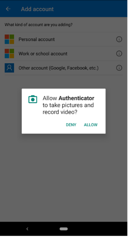 The first time you set up the Microsoft Authenticator app, you might receive a prompt asking whether to allow the app to access your camera. On iPhone or Android, select Allow so the authenticator app can scan the QR code.