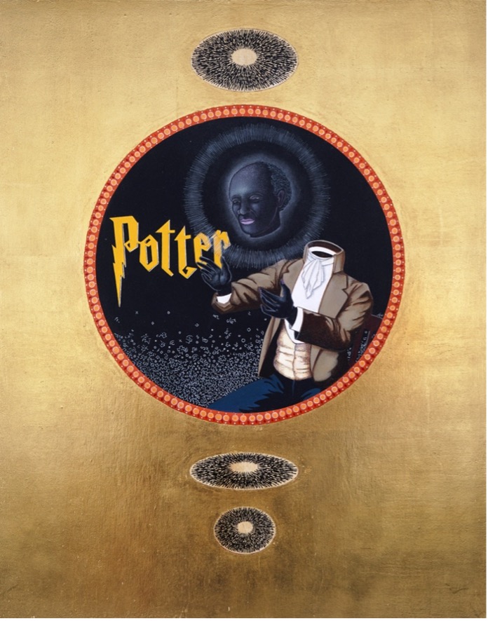Greenfield’s work weaves together themes of race, identity, and historical memory with visual complexity and spiritual symbolism. He interrogates how African American identity is constructed, distorted, omitted, or stereotyped in broader culture, often revealing what has been erased or hidden from mainstream narratives. His current practice retrieves lesser-known figures, events, and stories—folk saints, martyrs, and enslaved people—bringing them into visibility. Greenfield borrows from religious art, particularly Christian iconography, as well as Yoruba Egungun, which grounds his work both as a critical investigation of symbols and images, as well as well as a sincere practice of spirituality and ritual play. Symbols such as halos, mandalas, gold leaf, and devotional imagery are reimagined to honor and valorize Black subjects. Many of his works juxtapose past and present, beauty and violence, placing scenes of religious serenity or reverence alongside stark depictions of racial violence and social injustice, creating a tension that challenges viewers to confront the complexities of history and memory.