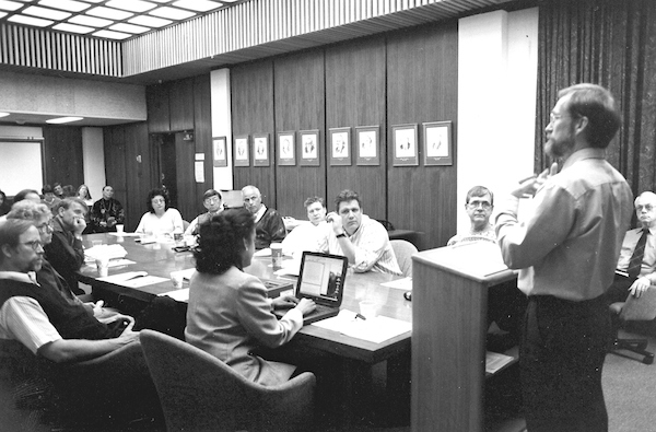 The first PACCD Board of Trustees in 1966, along with Superintendent/President Armen Sarafian (seated, second from right).
